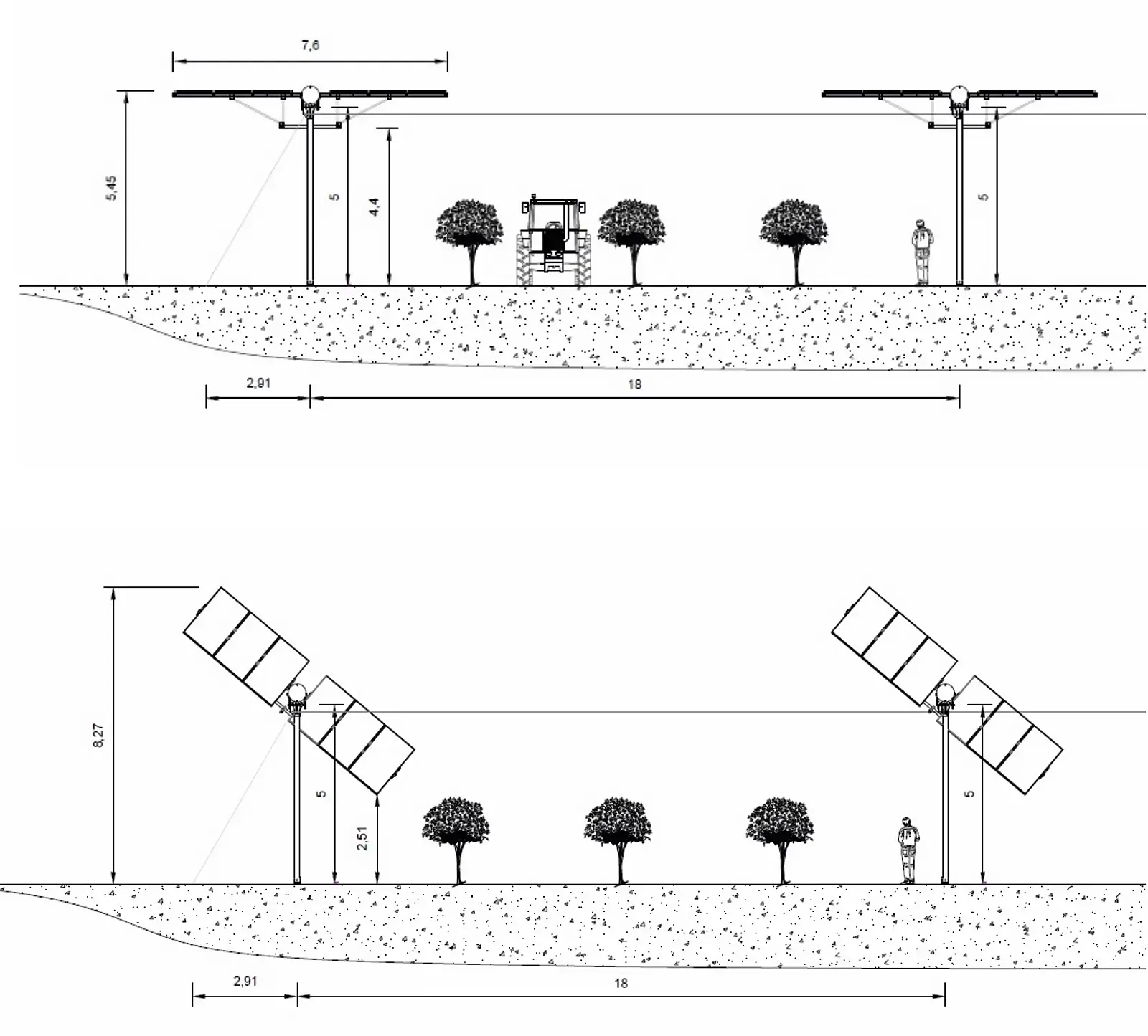 Den type af agrivoltaiske installation, som vi har søgt om, består af solpaneler opstillet på slanke stålstativer i rækker med en indbyrdes afstand på op til 18 meter, og med en maks. højde på stativer på 5,5 m. Panelerne monteres på drejemekanismer, der følger solen, og som kan drejes til yderpositioner efter behov. Hvis solpanelerne stilles vertikalt – for f.eks. at fjerne sne – rækker de 8,5 m op.